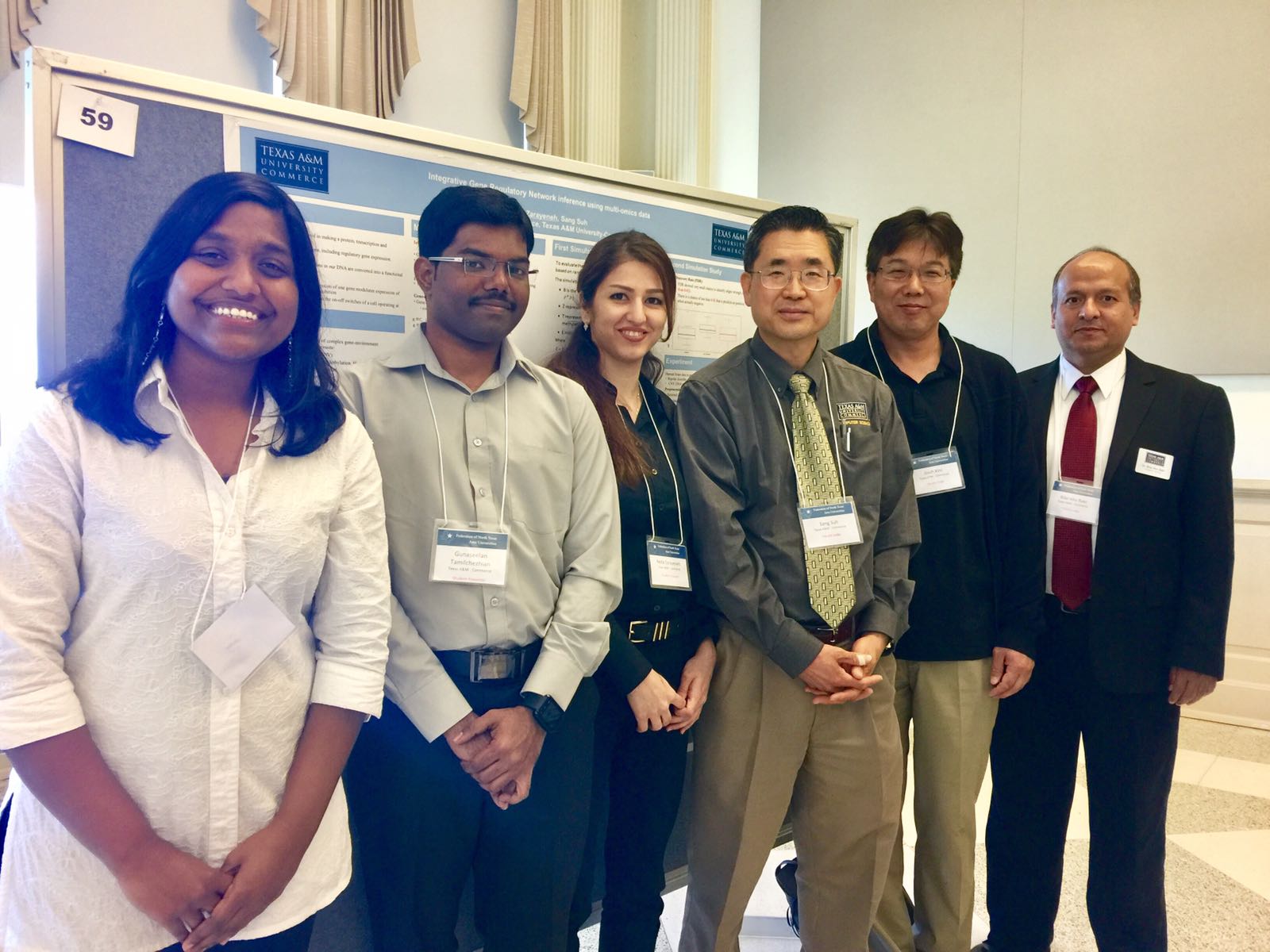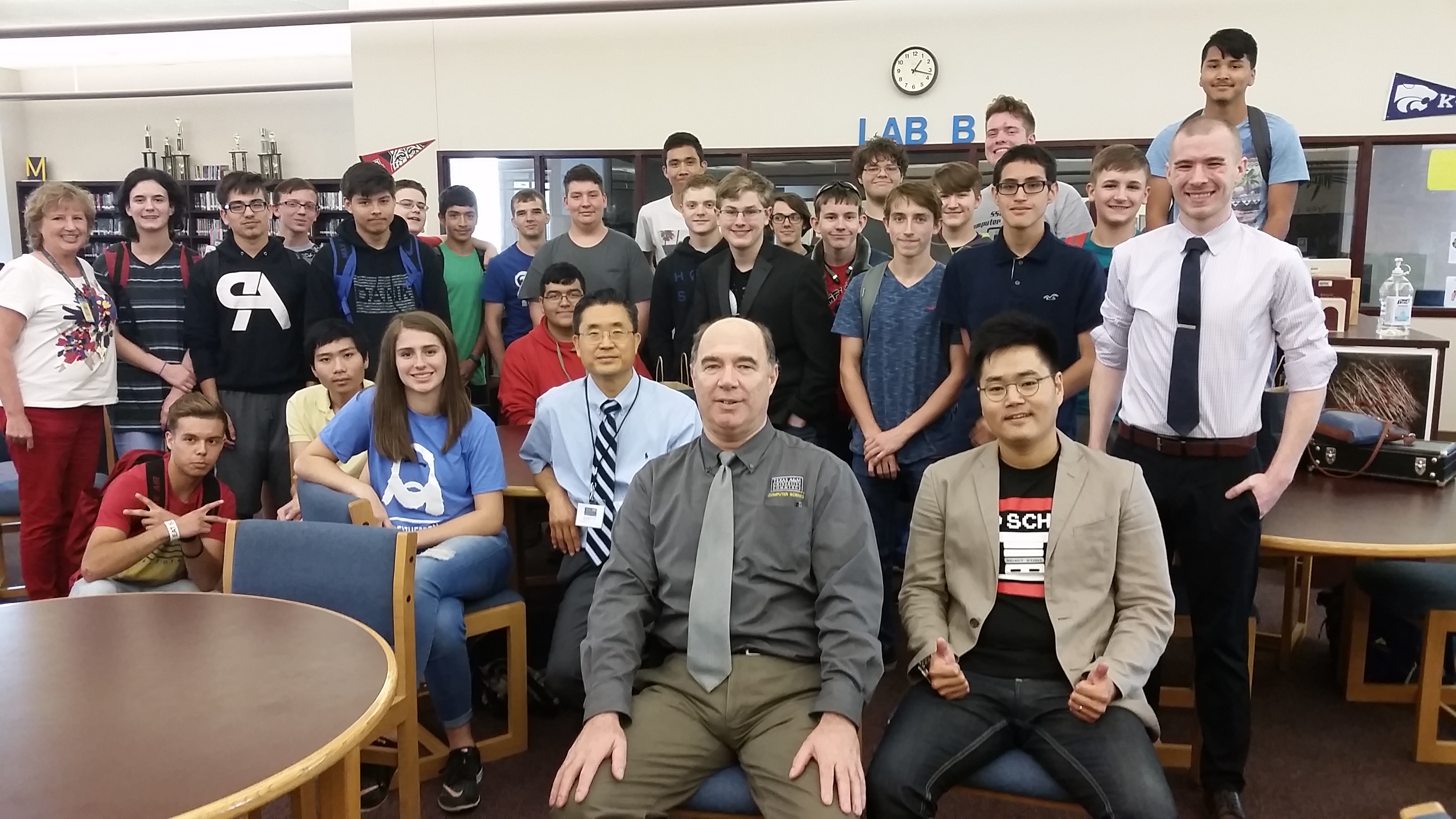 Sulphur Springs High School (SSHS) Computer Science Fair, May 19th, 2017. Attendees are Dr. Sang Suh, Dept. Head of Computer Science, Dr. Nikolay Sirakov and Dr. Dongeun Lee. Far left is Ms. Gena Wilders, Computer Science teacher at SSHS.