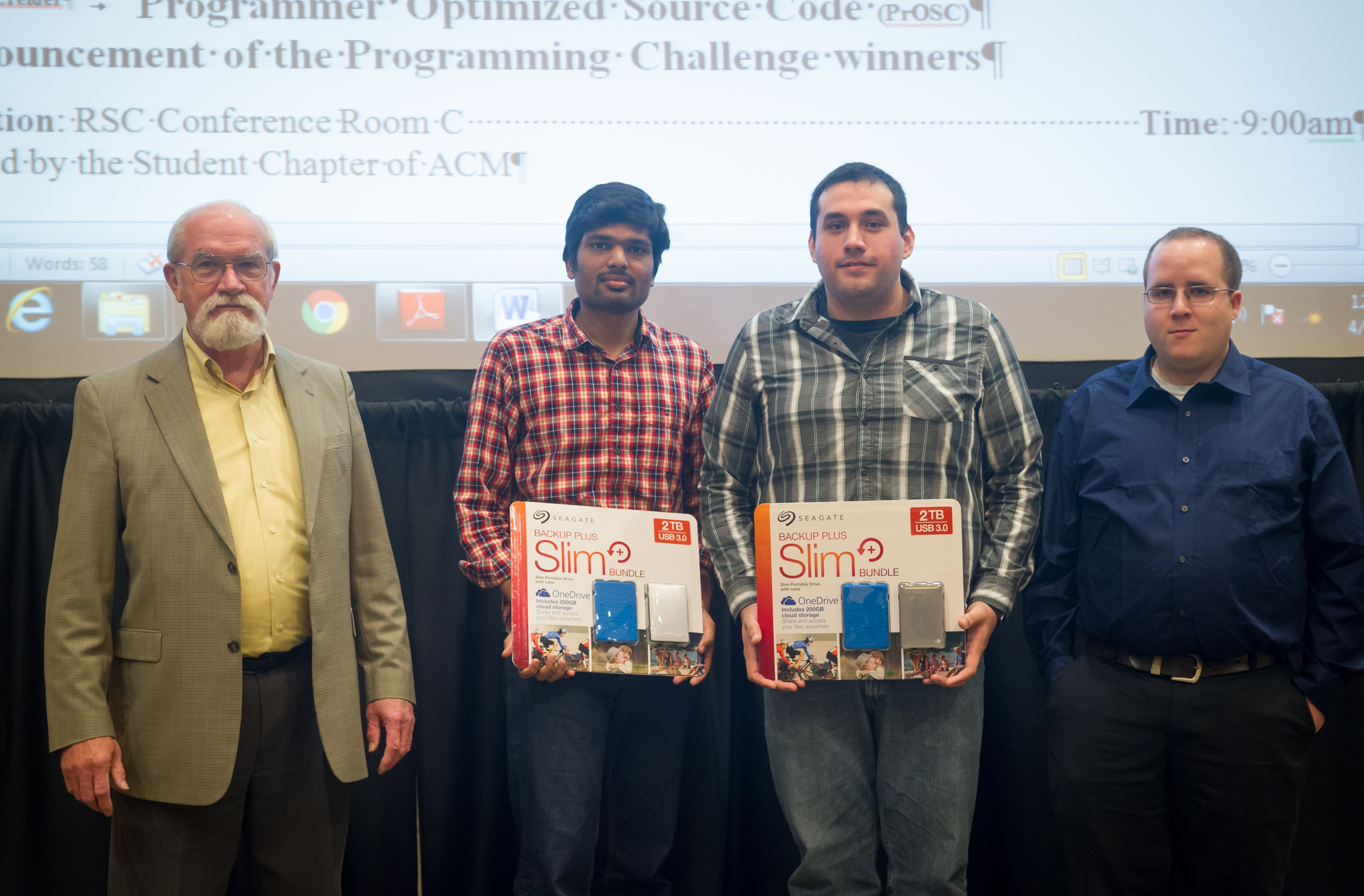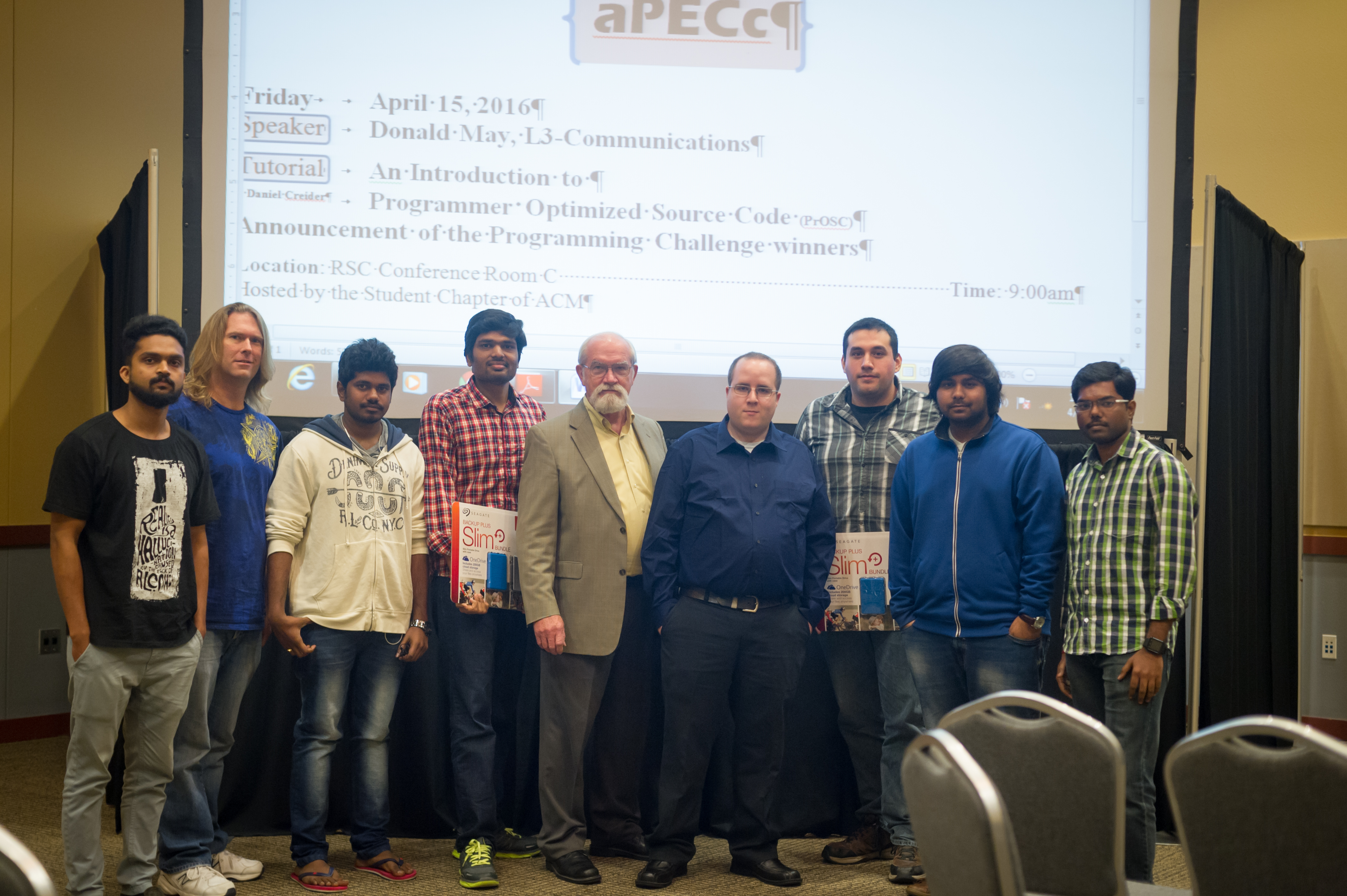 The First Annual Programming Efficiency Conference and Challenge (aPECc) was held on April 15, 2016 on the campus of Texas A&M University Commerce. The invited speaker was Donald May from L3-Communication in Greenville, Tx. Donald is a graduate of the Department of Computer Science at TAMUC and discussed some issues that are encountered in writing efficient code as a professional programmer. A short tutorial was given by Dr. Daniel Creider, associate professor in the Department of Computer Science at TAMUC. The topic of the tutorial was an area of Dr. Creider's research, "An Introduction to Programmer Optimized Source Code". The programming challenge consisted of finding the mode(s) in a data set of at least 30 million random data values. The winners were selected based on the fastest execution speed for a series of data sets. The undergraduate winner was David Rojas and the graduate winner was Jithendar Anandan. Photos from the event are shown below.